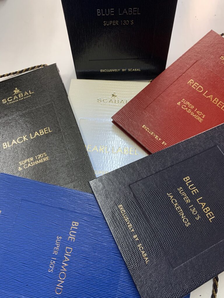 Here are the fabrics for Scabal’s blue label 130’s and blue label jacketing 130’s. The colours showed the major difference between suits and jacketing. The definition for “suit” is formal and “jacket” is smart casual. Dark with solid colours are for suits and brighter with fancy patterns are for jacketing. Pick the right colours for your occasions.